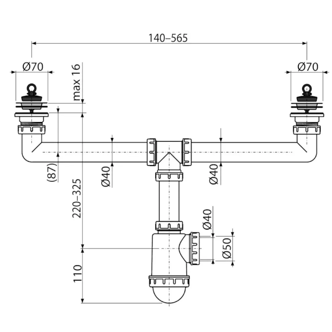 Sifon voor dubbele spoelbak met roestvrijstalen roosters DN70