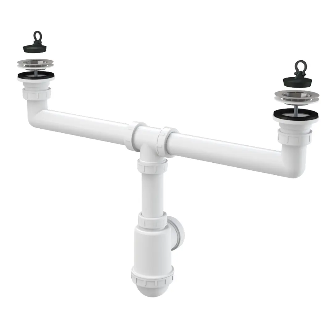 - Inhoud verpakking: sifonhuis met twee uitgangen, PVC plug 2 stuks, roestvrijstalen afvoerrooster 2 stuks