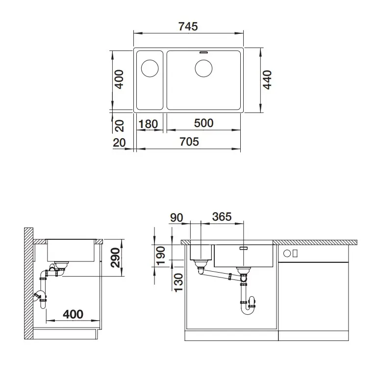 - afmeting van de kleinere spoelbak 180 x 400 mm
