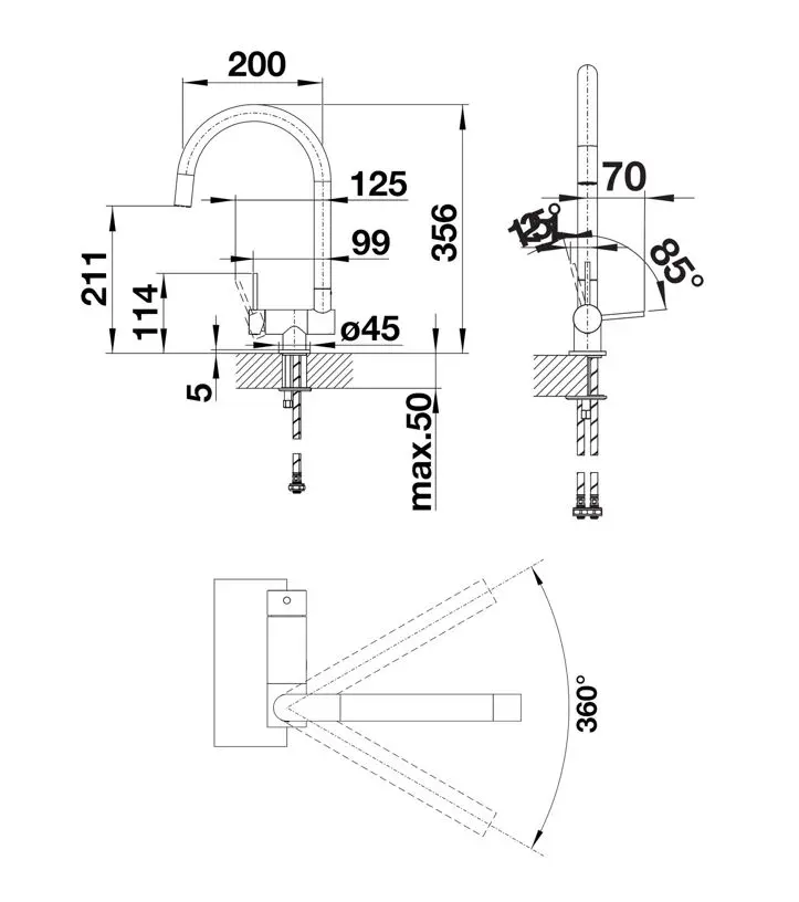 - kantelmechanisme geeft de mogelijkheid om de kraan naar de opzij te kantelen