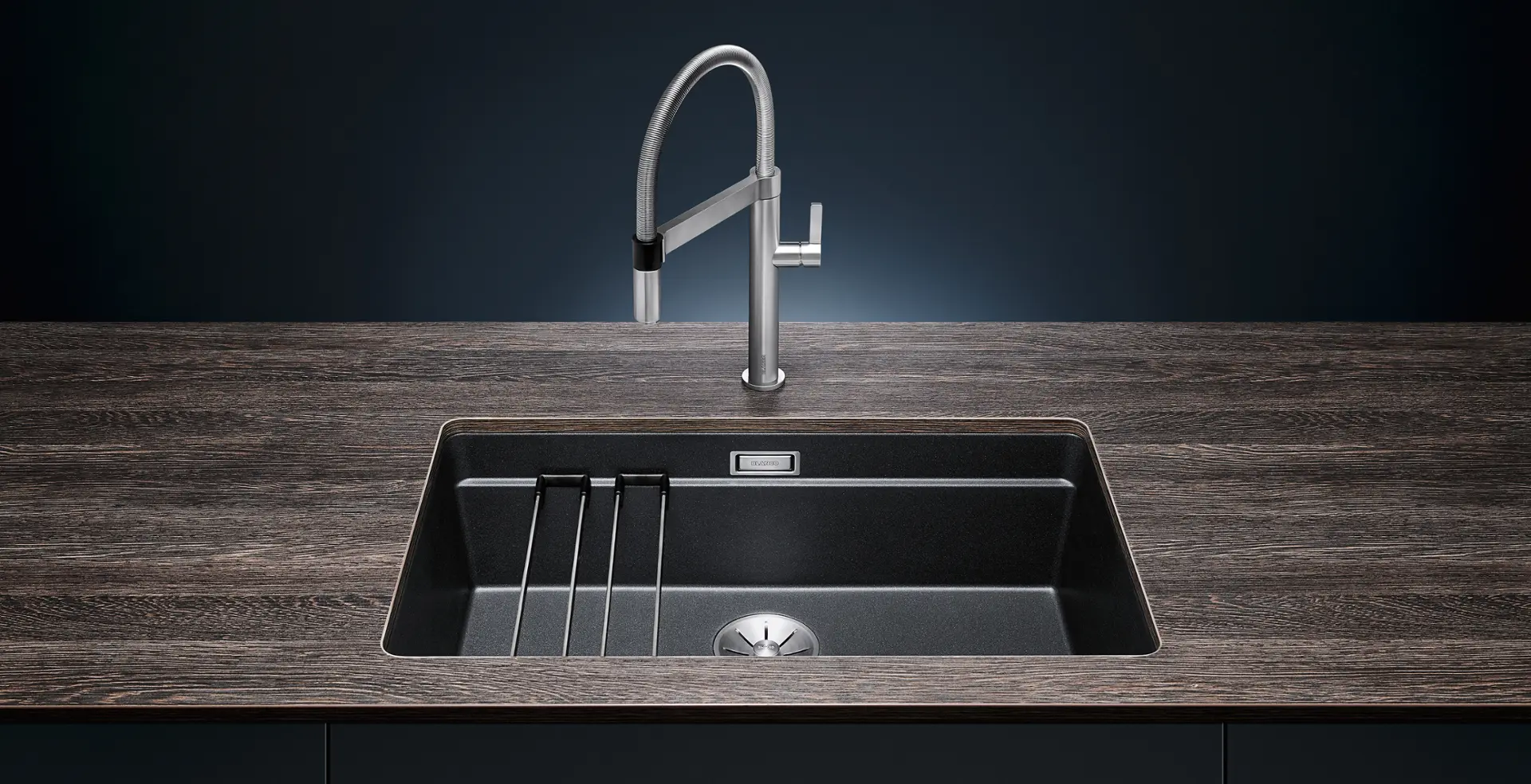 Geef jouw keuken een upgrade met deze zwarte onderbouw spoelbak van silgranit zonder afdruip. De Blanco Etagon 700 productlijn is uitgerust met een extra niveau waarop je universele rails kunt zetten en daar bijvoorbeeld potten of groenten plaatsen. De gootsteen is gemaakt van een duurzaam materiaal – SILGRANIT® PuraDur®, dat voor 80% uit graniet bestaat. Blanco Etagon 700 spoelbak is ontworpen voor montage onder het werkblad in een onderkast met een minimale breedte van 800 mm.