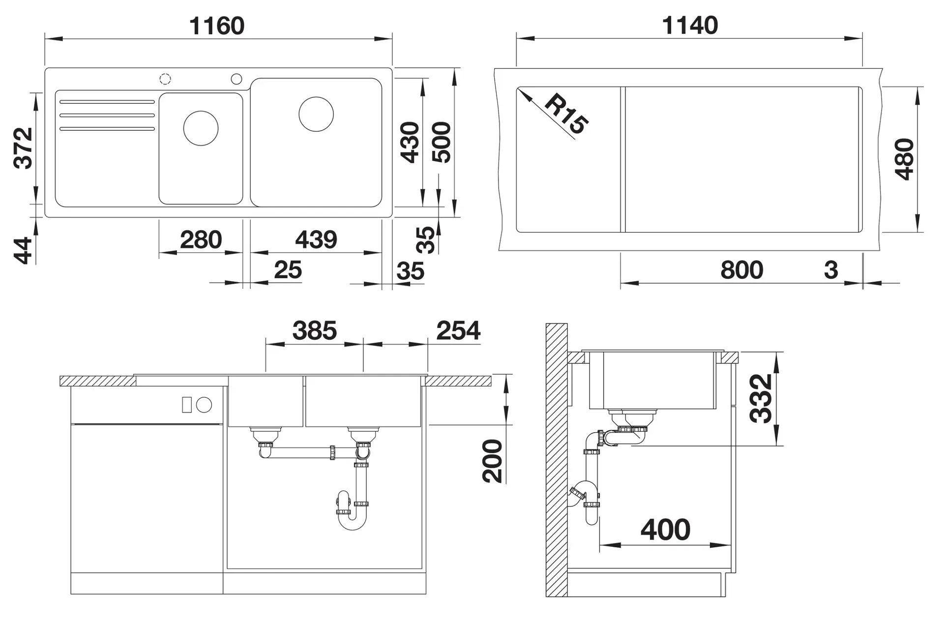 - afmetingen van de grotere spoelbak 439 x 430 x 200 mm