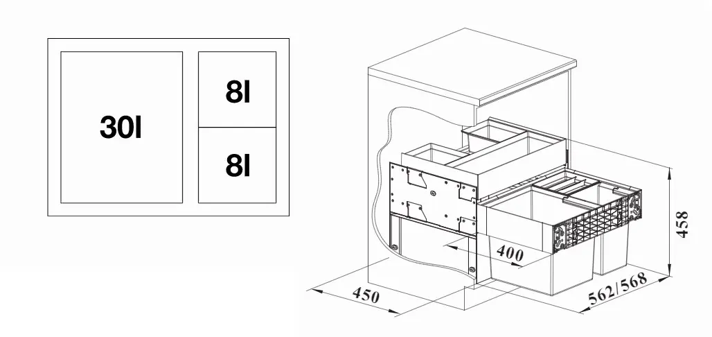 - kan worden ingebouwd in onderkasten met cassettedeur met een frame vanaf 40 mm