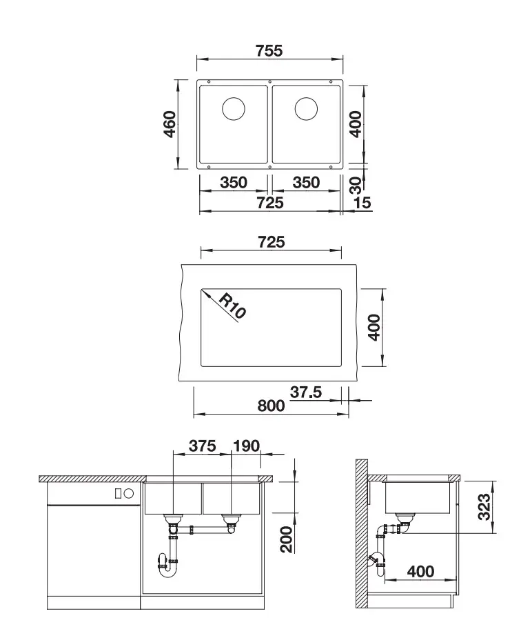 - totale afmeting van de spoelbak: 755 x 460 mm