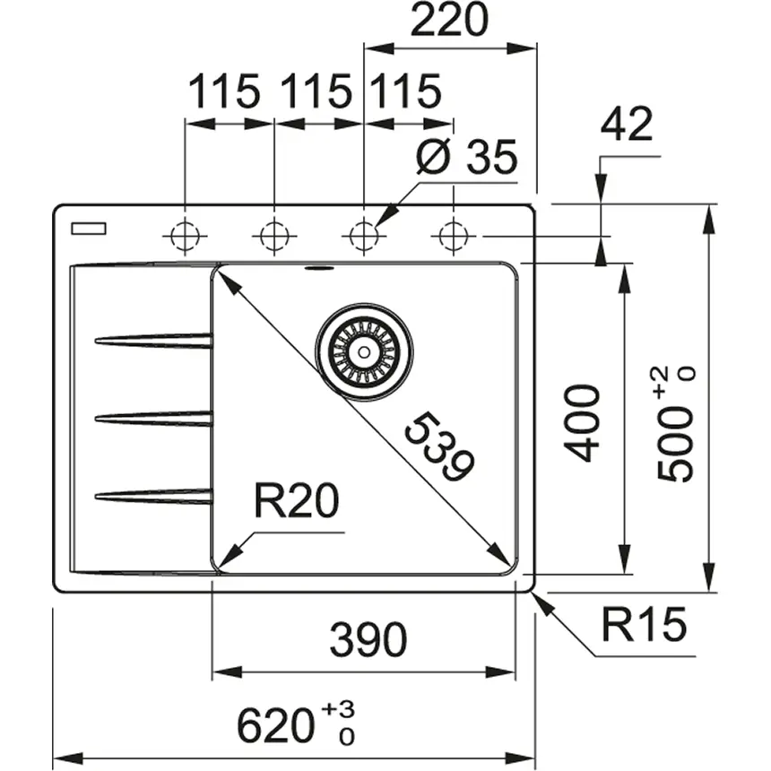 - uitsnede 600 x 480 mm (radius 15 mm)