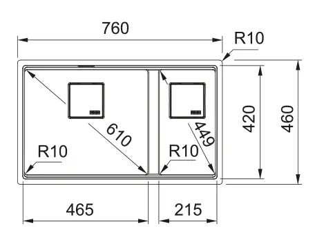 - binnenmaat van de grotere spoelbak 464 x 420 mm