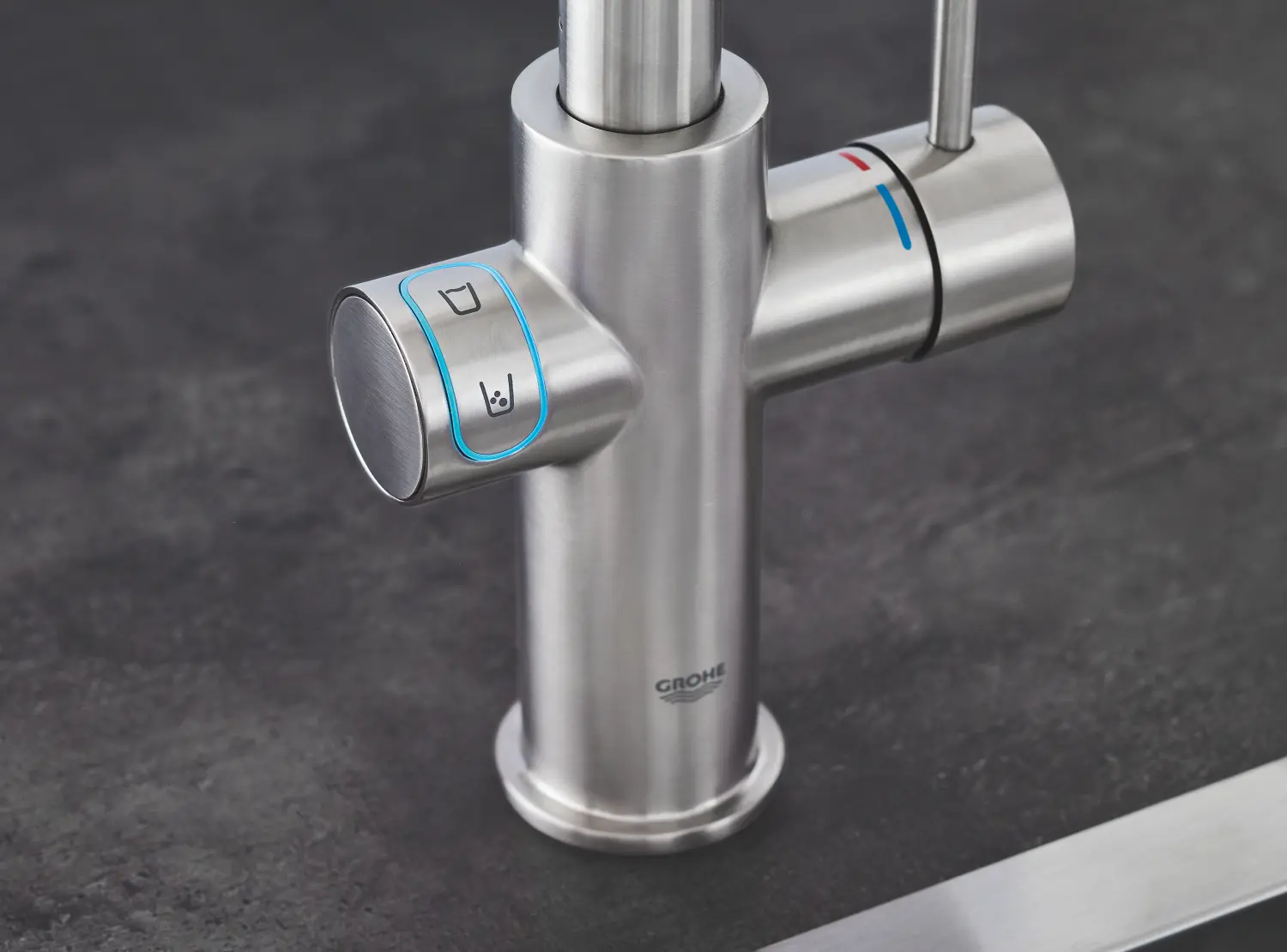 - instelling filtertype – GROHE Blue filter met maat S, GROHE Blue actief koolstoffilter of GROHE Blue magnesium filter