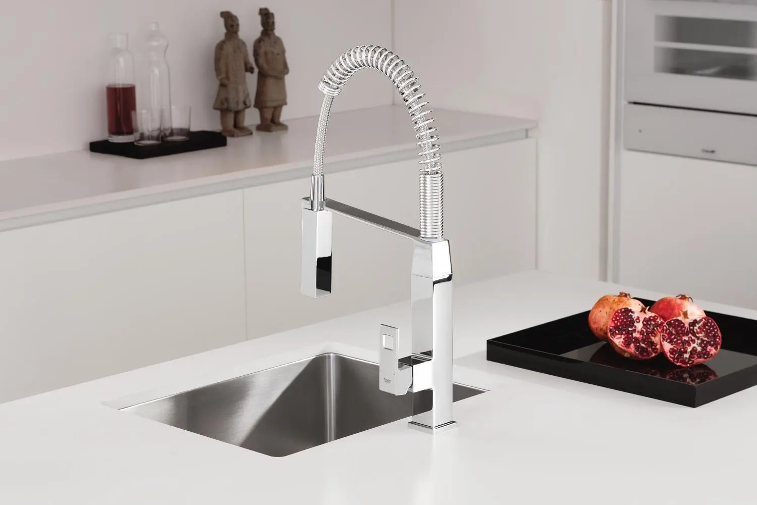 Met de GROHE Eurocube keukenkraan geef je je keuken een karakter alsook verbazingwekkende prestaties. Hij past perfect bij moderne keukens en staat garant voor optimaal gebruikersgemak. Hiervoor zorgt een aantal functionaliteiten. Om te beginnen met een flexibele, hoge uitloop die verder uitgerust is met een sproeikop met twee straalsoorten. Met een klik op de knop kun je soepel schakelen tussen een fijne waterstraal en een krachtige Jet Spray waarmee je de spoelbak in een oogwenk hebt afgespoeld. De uitloop is ook eens draaibaar voor nog meer flexibiliteit. Voor levenslange soepele beweging van de hendel zorgt dan een hoogwaardige GROHE SilkMove keramische kardoes.