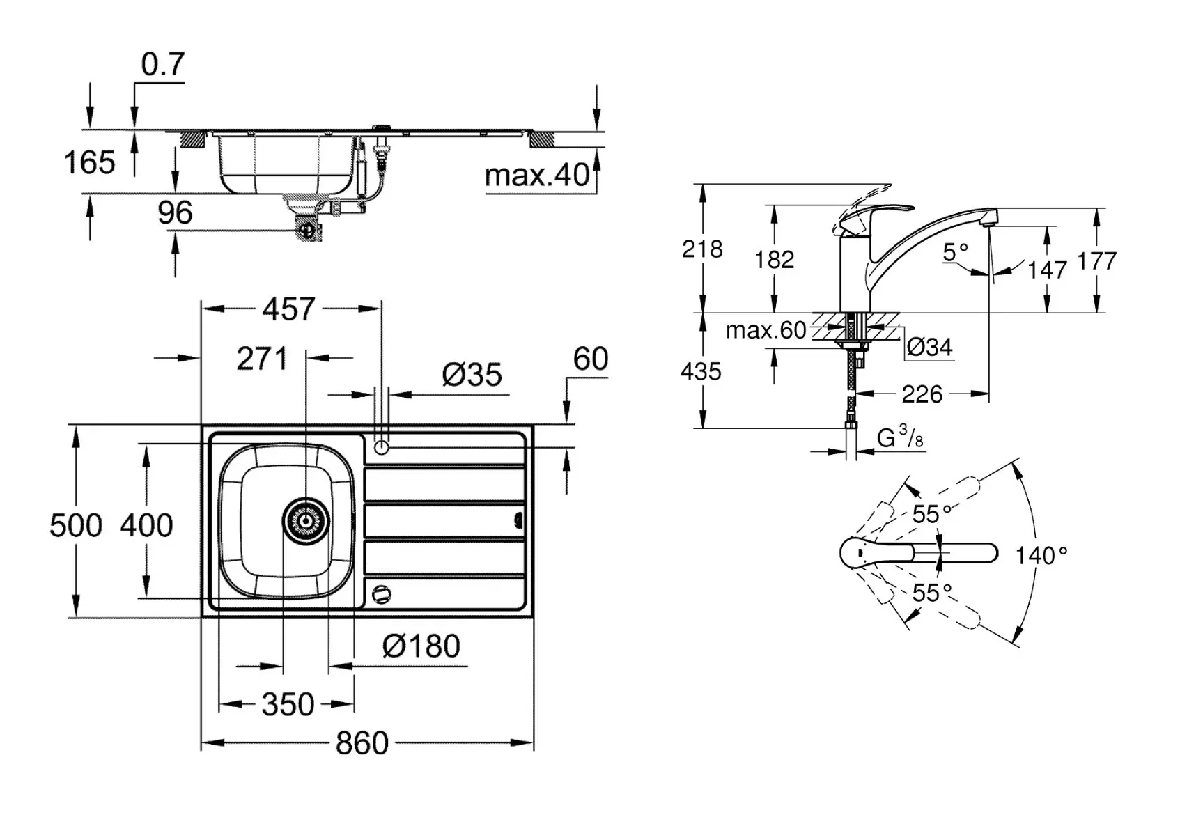 - enkele spoelbak afmetingen: 350 x 400 mm