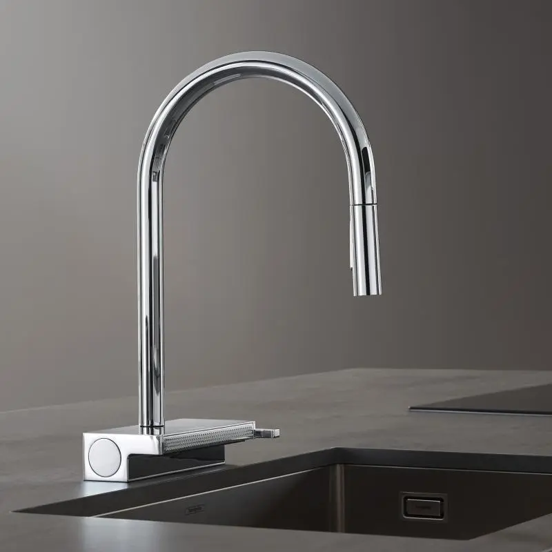 De hansgrohe Aquno Select keukenkraan mag in geen moderne keuken ontbreken. De kraan is voorzien van een uittrekbare sproeikop en bovenop van een unieke vlakke perlator voor een ultieme douchestraal – SatinFlow, die bestaat uit namelijk 133 afzonderlijke sproeiers waardoor je alles grondig, maar toch voorzichtig afspoelt.