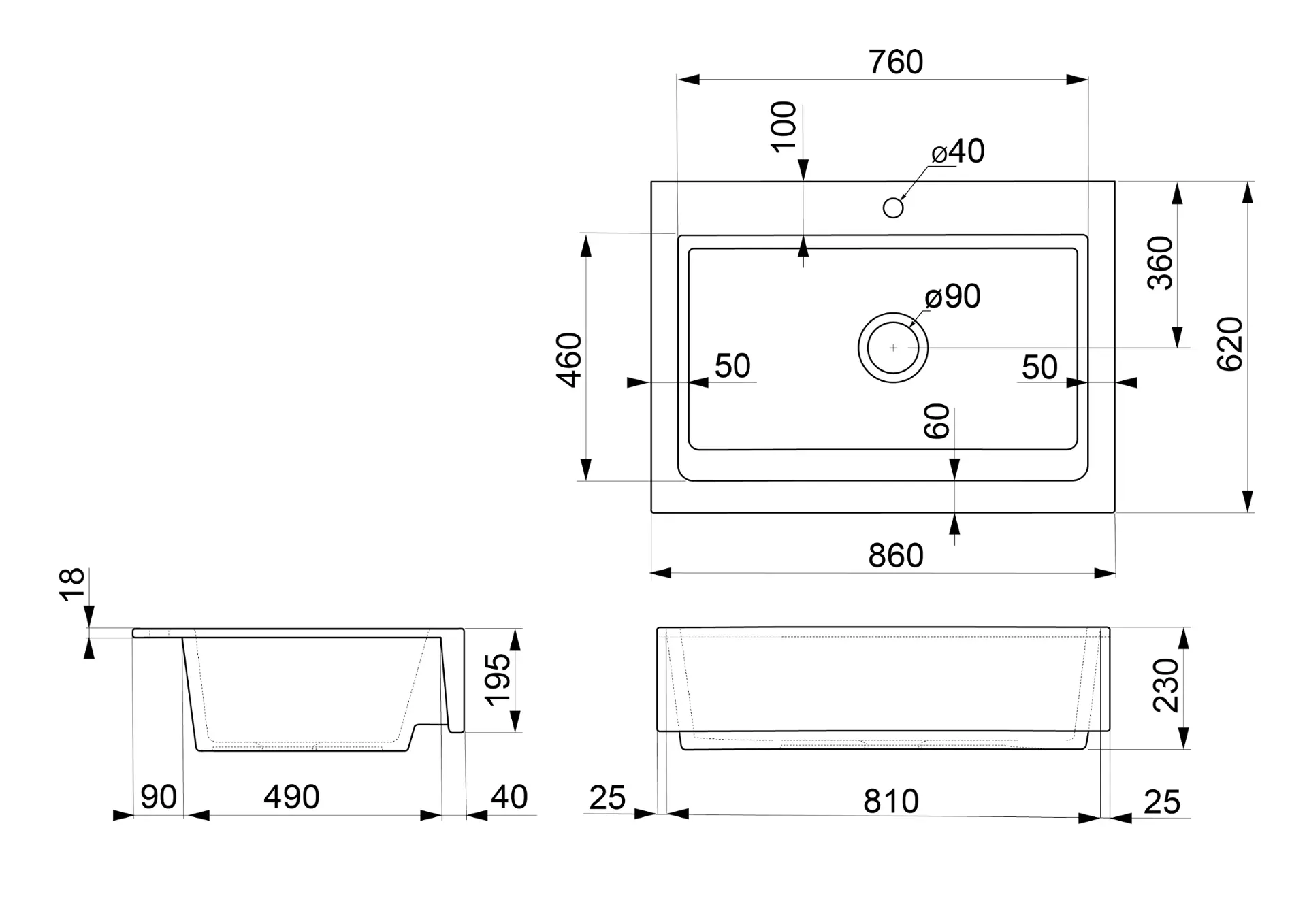 - afmetingen van de spoelbak: 860 x 620 x 230 mm